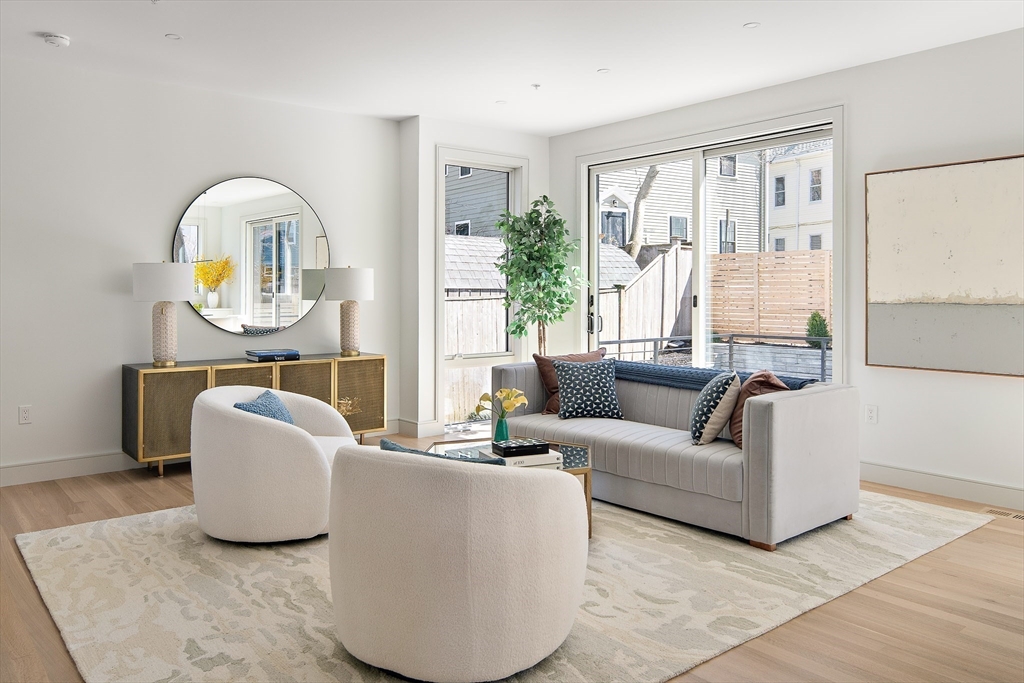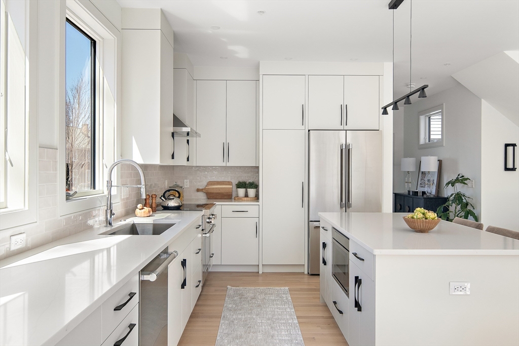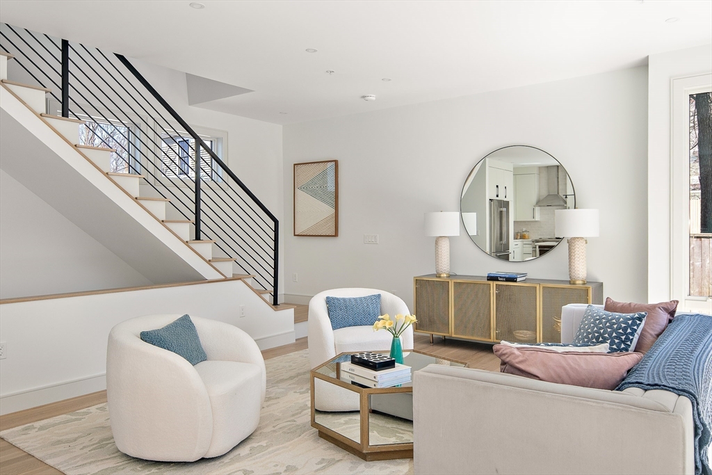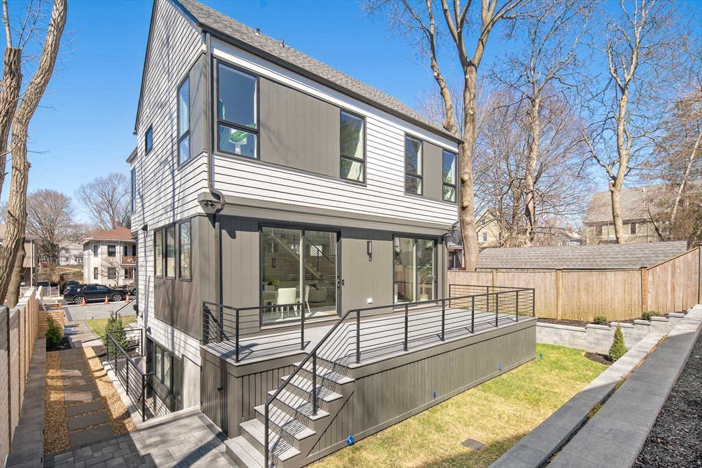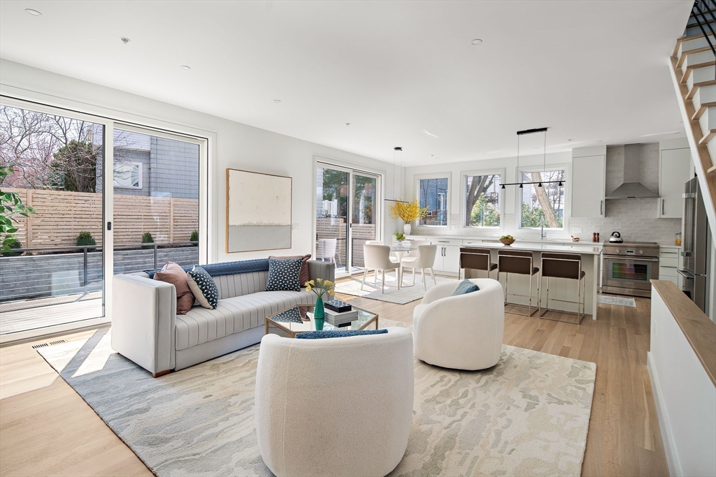 Sun drenched and impeccably crafted, this newly built home offers refined modern living with elevated finishes throughout. The main level features high ceilings, an open living and dining area, and oversized glass doors leading to a private deck and landscaped yard, ideal for indoor outdoor living. The kitchen is outfitted with custom cabinetry, quartz countertops, and a Thermador appliance suite. A modern staircase leads to a generous primary suite with a private bath and dual closets, along with two additional bedrooms and a full bathroom. The lower level offers a spacious bedroom or office, a full bath, a family room with walk out access to outdoor space, and a laundry room. Designed for comfort and efficiency, the home includes a heat pump system, ERV ventilation, and foam insulation. Ideally located near Fresh Pond and Huron Village, minutes from Sofra, Intelligentsia, and public transportation to Harvard Square and Cambridge destinations.