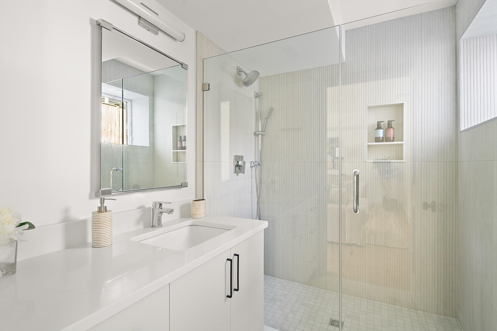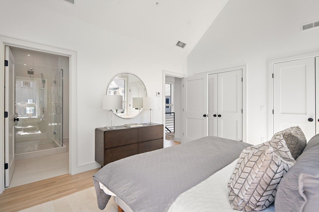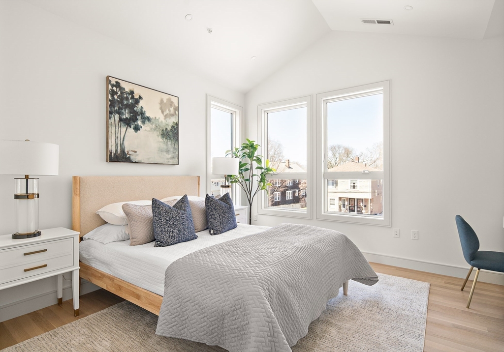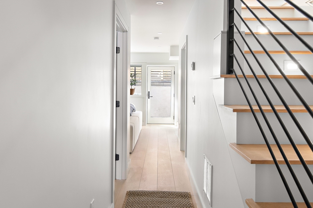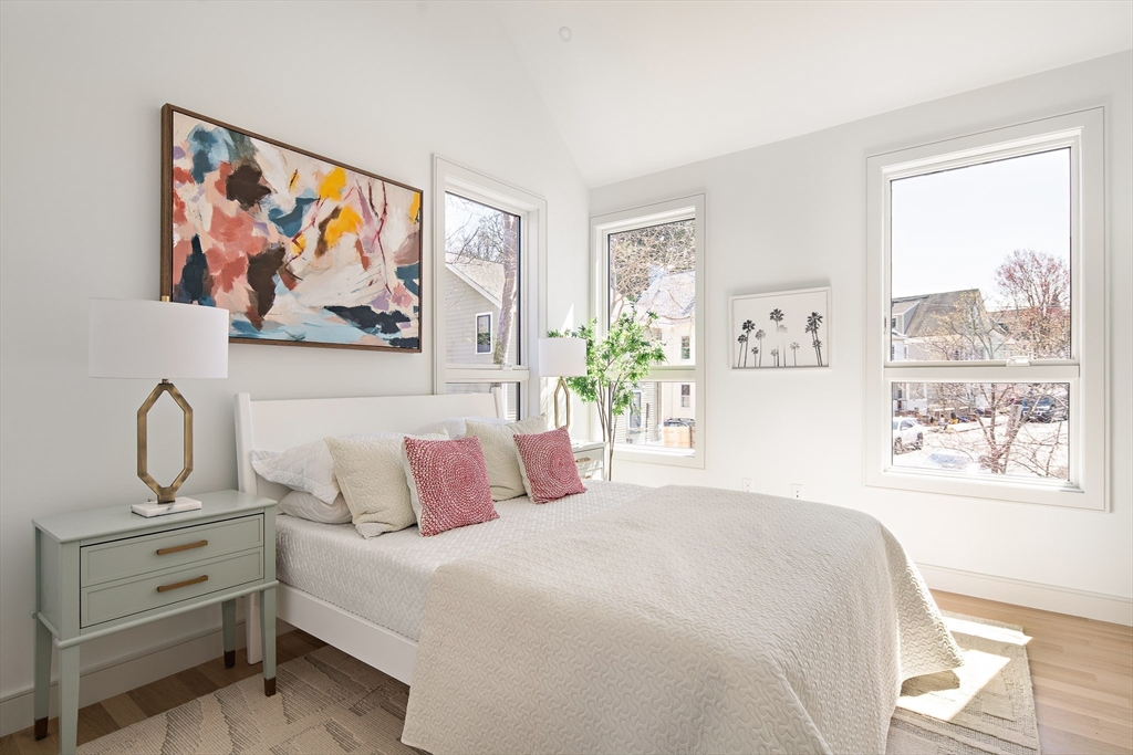 Sun drenched and impeccably crafted, this newly built home offers refined modern living with elevated finishes throughout. The main level features high ceilings, an open living and dining area, and oversized glass doors leading to a private deck and landscaped yard, ideal for indoor outdoor living. The kitchen is outfitted with custom cabinetry, quartz countertops, and a Thermador appliance suite. A modern staircase leads to a generous primary suite with a private bath and dual closets, along with two additional bedrooms and a full bathroom. The lower level offers a spacious bedroom or office, a full bath, a family room with walk out access to outdoor space, and a laundry room. Designed for comfort and efficiency, the home includes a heat pump system, ERV ventilation, and foam insulation. Ideally located near Fresh Pond and Huron Village, minutes from Sofra, Intelligentsia, and public transportation to Harvard Square and Cambridge destinations.